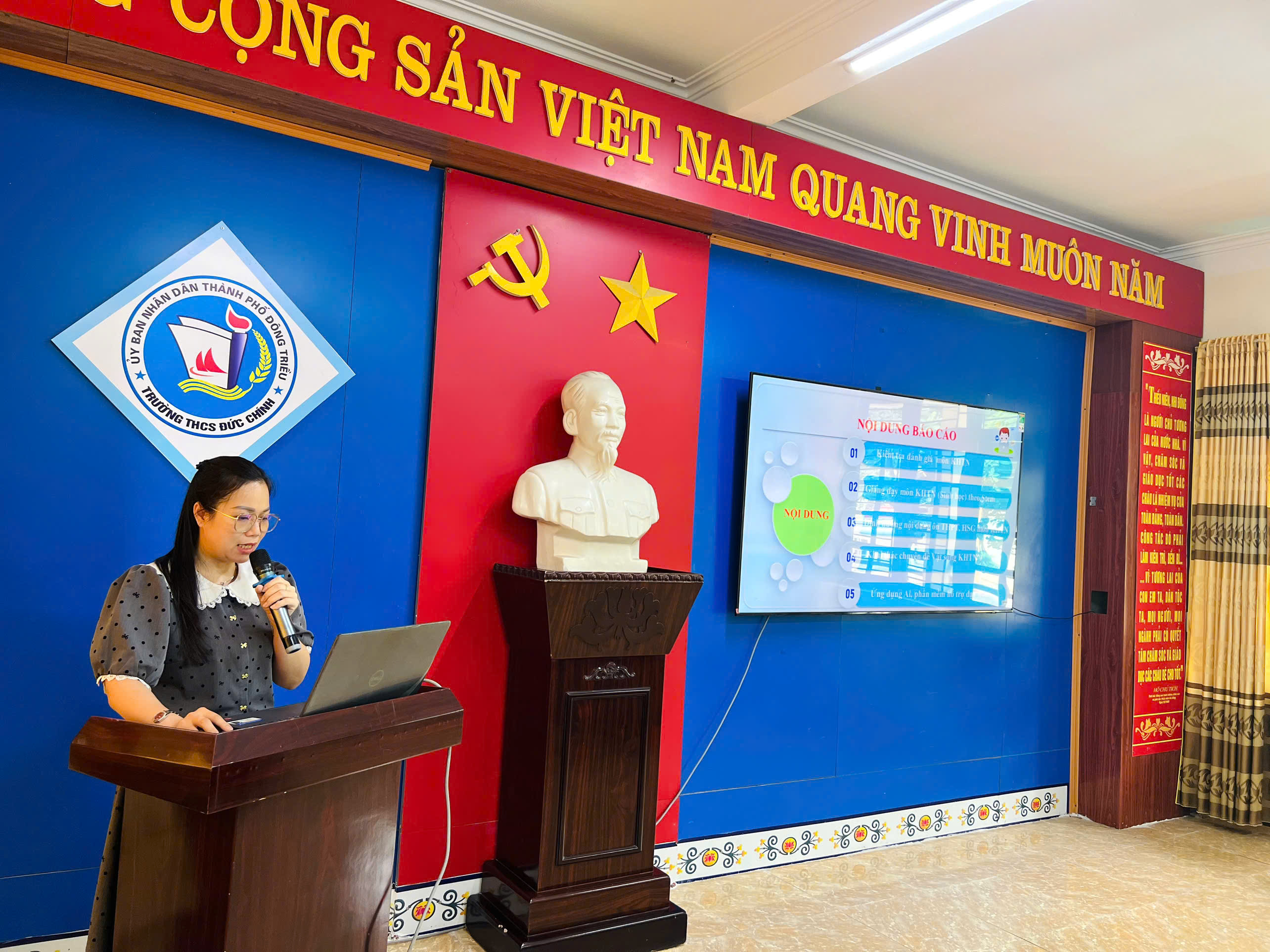 Tiếp theo là đồng chí Lương Thị Lệ Trang – Giáo viên trường THCS Tràng An báo cáo phân môn Hoá học về nội dung "Nội dung mới và khó trong KHTN 9; Thảo luận ôn tuyển sinh vào 10; Ứng dụng CNTT, sử dụng AI hỗ trợ dạy học môn KHTN…"